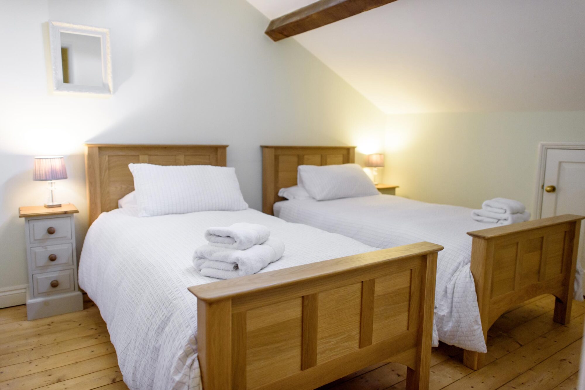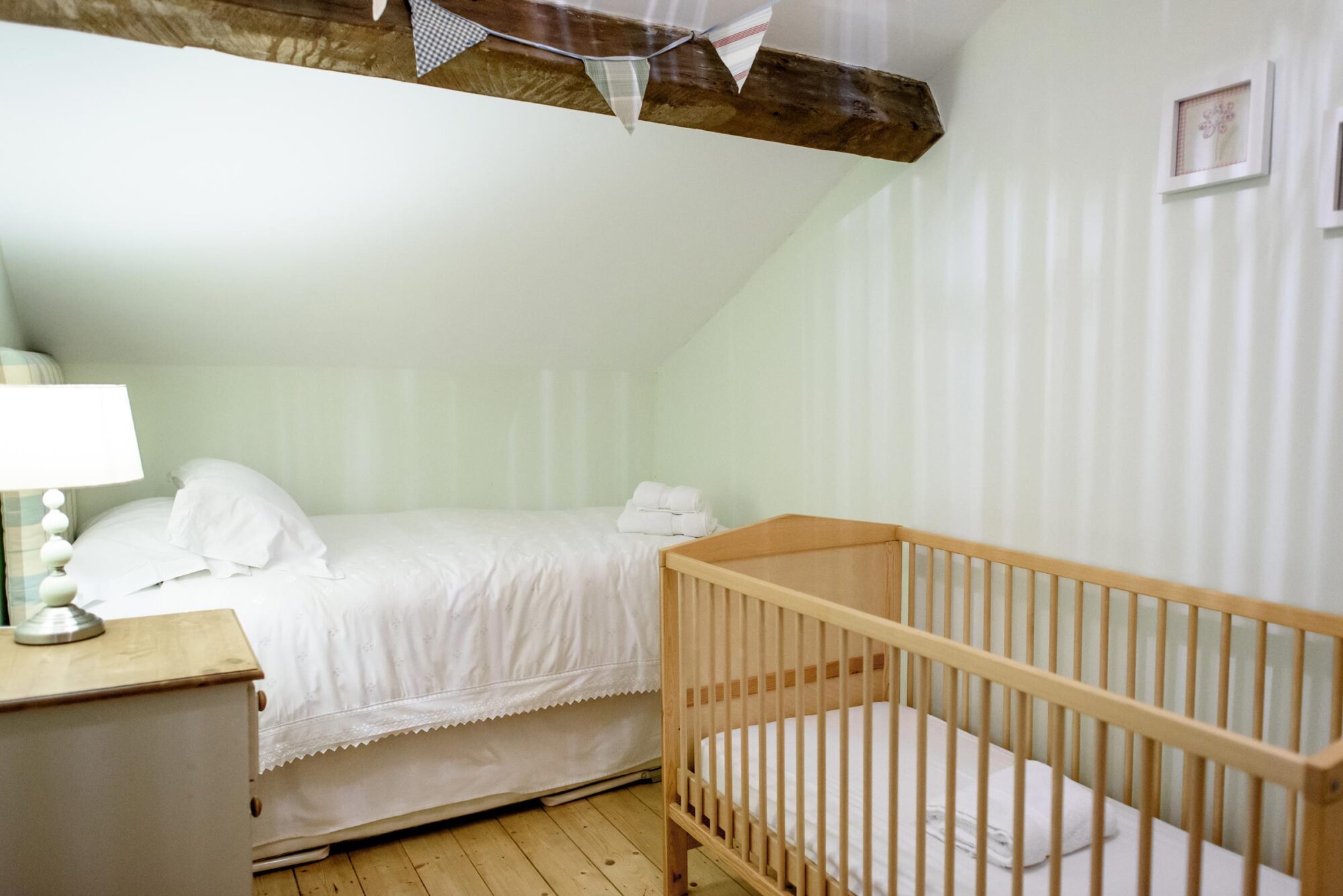The cottage interior is smart and contemporary. Guests enter from the courtyard, or directly through the patio doors that open onto views of woodland. The generous ground floor living space comprises a useful lobby area, with plenty of room for coats and shoes, a huge and airy kitchen/diner, with further patio doors opening onto the Juliette balcony, a comfortable living room with all new furnishings, and a brand new shower room with over-sized shower and sensor lighting. Upstairs the space has been cleverly used. The two bedrooms (one twin room and one double bedroom) have ample storage and quirky triangular windows. There is also a further family bathroom, with bath and over-bath shower. Finally, leading on from the double bedroom is a bonus room, which has a cot as well as a single bed. There are no windows in this room, negating the need for blackout blinds for early risers, but cheery bunting and furnishings make it very attractive to mini guests.