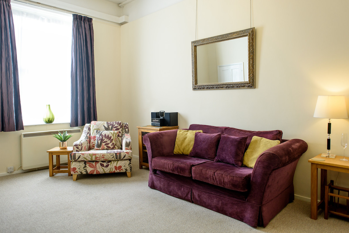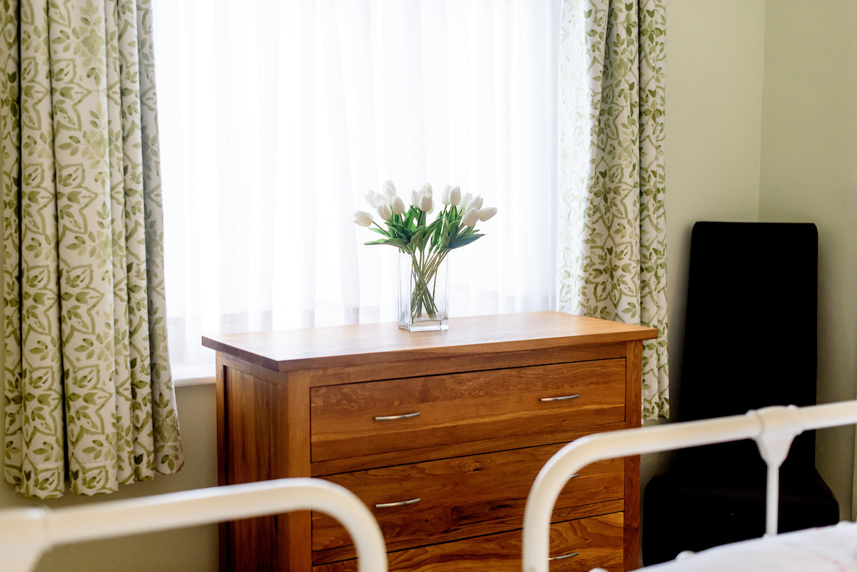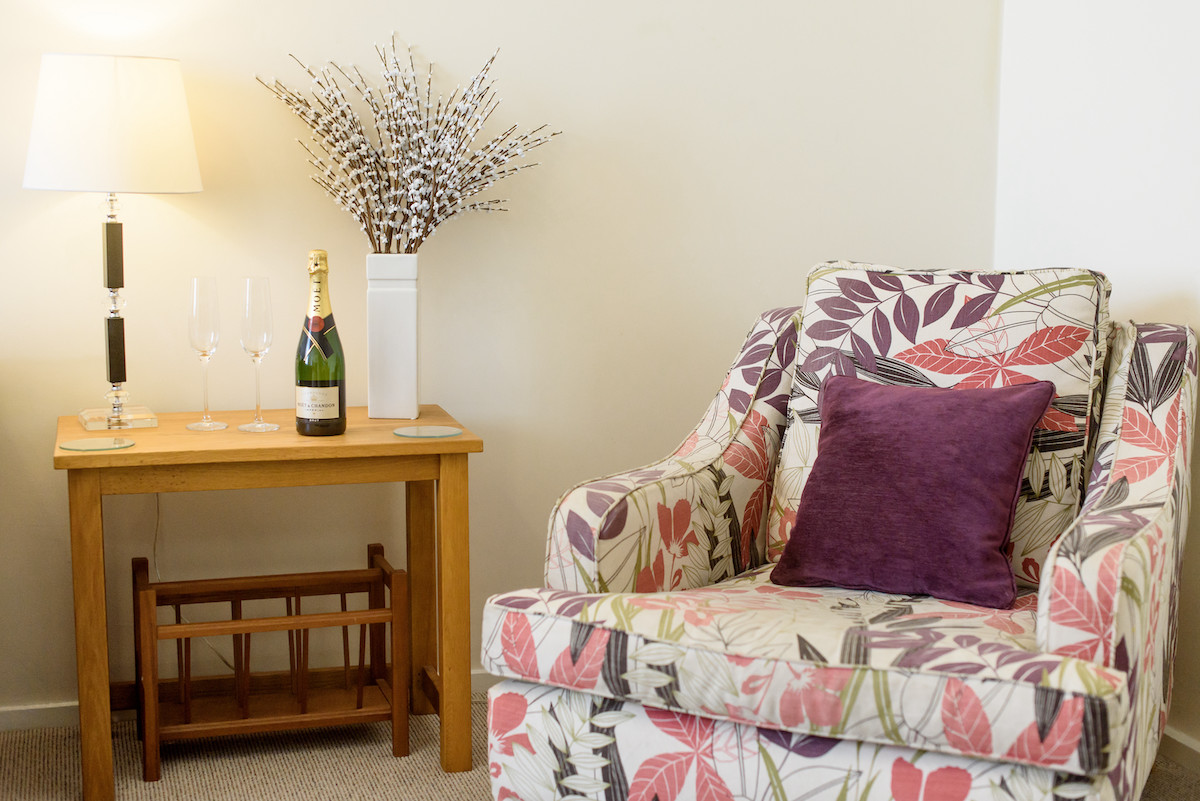 The cottage interior is country chic, with high quality furnishings and fitting throughout. Guests may enter either from the Courtyard, or directly through the French doors that open south over the large balcony and offer views of established woodland. The spacious ground floor living arrangement comprises a wide entrance hall, with plenty of room for coats and shoes, a bright and airy kitchen/diner/living room with 12 ft ceilings, and a cosy reading area. Finally, there is a large twin bedroom and separate WC.